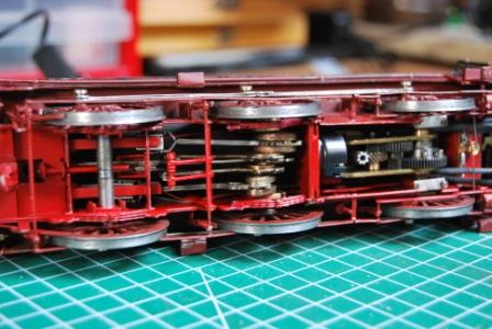 Het frame. Het frame is opgebouwd uit meerdere lagen. De basis is een nikkelzilveren frame waarop overlays zijn gesoldeerd. Dit past allemaal precies maar vereist wel enige nauwkeurigheid. De basis van het frame wordt samengesteld uit verschillende nikkelzilveren onderdelen. Het frame bestaat uit frameplaten welke door tussenplaten op de juiste afstand worden gehouden. Voor een model volgens de ScaleSeven standaard moeten de tussenplaten worden gebruikt welke de afmetingen hebben om de frameplaten op de juiste afstand te houden. Deze tussenplaten voor ScaleSeven zijn bij het bouwpakket gevoegd. Aan de buitenzijde van de frameplaten worden de overlays gesoldeerd d.m.v het zgn. zweten. Deze overlays zijn heel gedetailleerde geëtste delen. In het frame worden de hornblocks gemonteerd. De beide achterassen zijn d.m.v compensatie stangen met elkaar verbonden. De vertragingskast en motor moeten kunnen blijven bewegen. Het voorste drijfwiel heeft een oplegging in het midden. Door deze constructie ontstaat de 3 punts ophanging. Aan het frame worden nog verschillende details gemonteerd zoals remblokken, zandstrooipijpen enz.